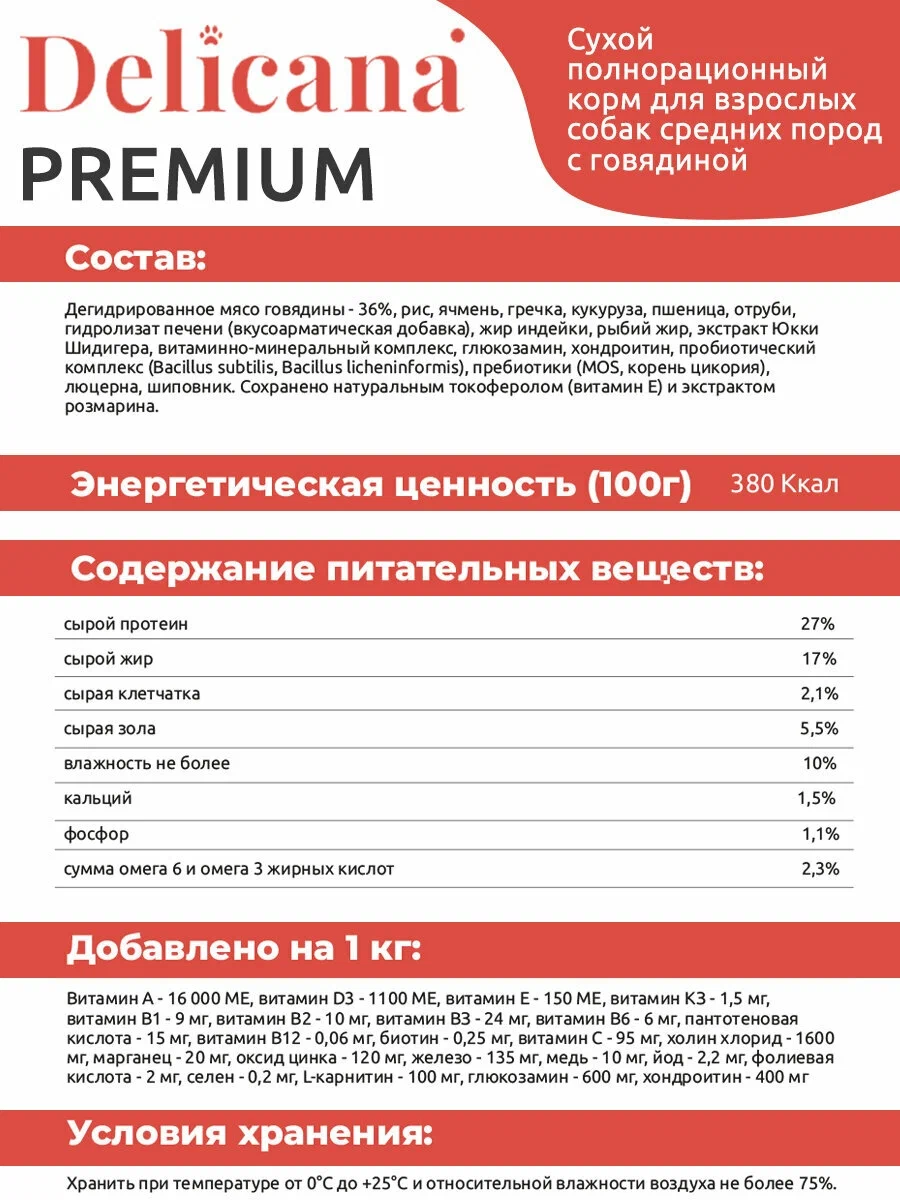 Delicana cухой полнорационный корм для взрослых собак средних пород с говядиной