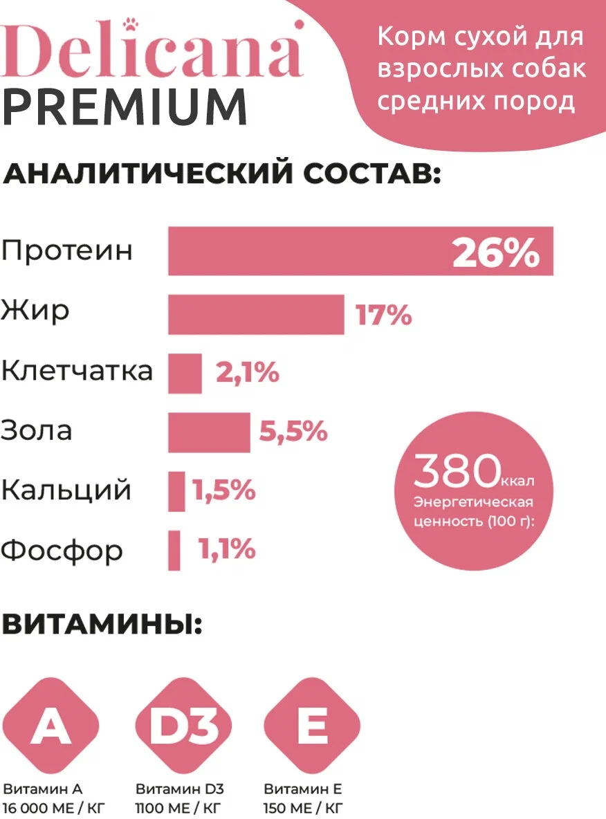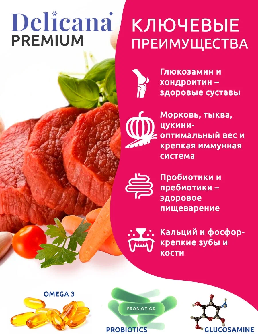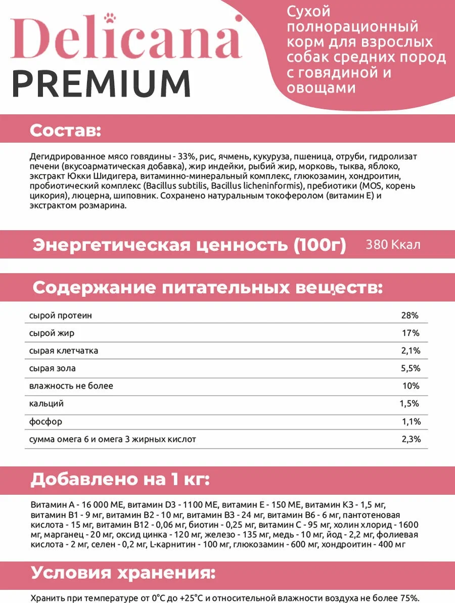 Delicana cухой полнорационный корм для взрослых собак средних пород с говядиной и овощами