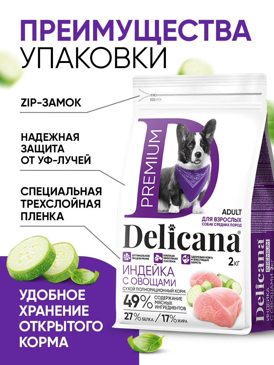 Delicana cухой полнорационный корм для взрослых собак средних пород с индейкой и овощами