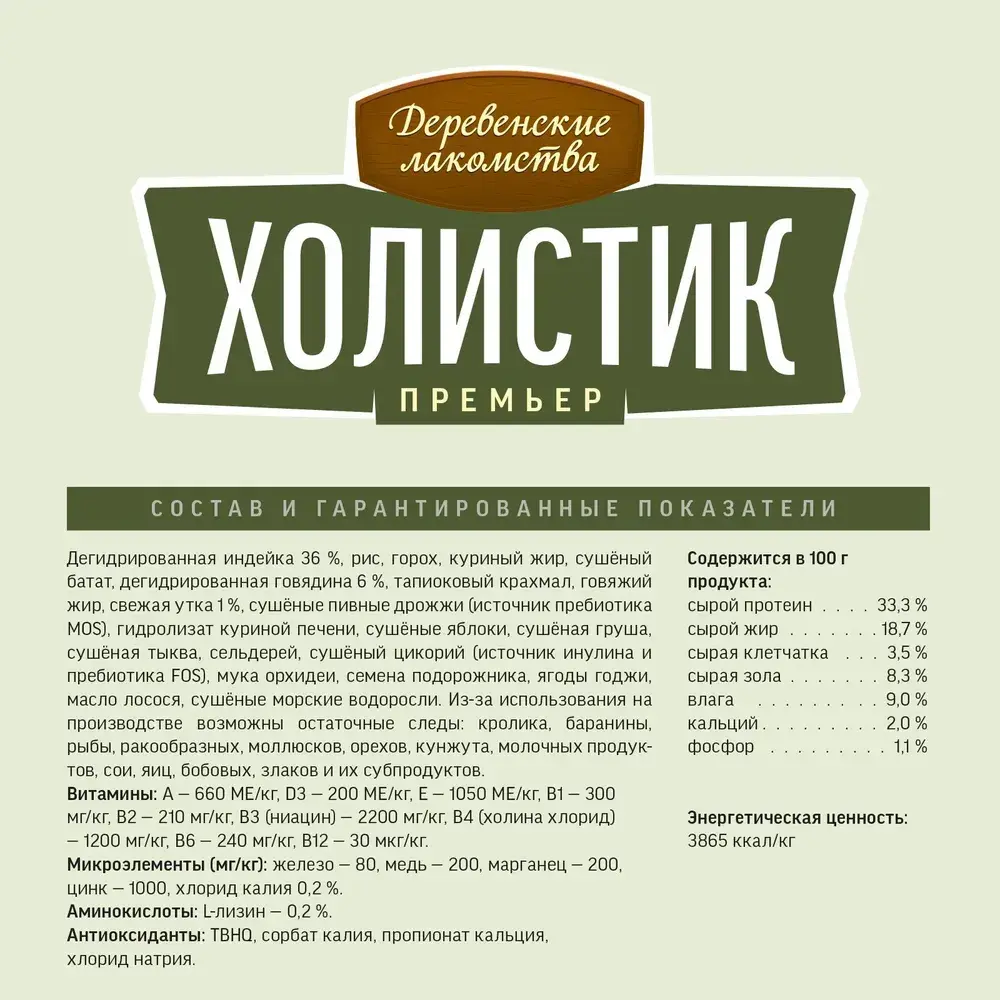 Сбалансированный, натуральный, полнорационный корм «Деревенские лакомства Холистик Премьер» обеспечивает питомцев всем необходимым для поддержания здоровья на каждом этапе жизни. Уникальные рецепты учитывают не только вкусовые предпочтения собак, но и их физиологические особенности, уровень активности и возраст.