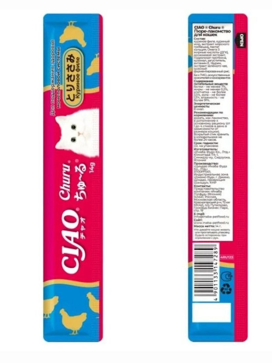 Функциональное пюре-лакомство CIAO Churu (ЧАО чуру) на основе нежного филе фермерской курицы. Содержит витамин Е и Омега-3 жирные кислоты, что оказывает противовоспалительный эффект и укрепляет иммунитет, а также правильный баланс минералов и аминокислот для поддержания здоровья мочеполовой системы. Пюре от японского производителя Inaba изготовлено исключительно из натуральных ингредиентов и отличается высоким процентом влажности, благодаря чему поддерживается водный баланс организма кошки. Корма и лакомства Inaba отличаются высоким качеством и неповторимым вкусом, ведь они изготавливаются только из отборных традиционных японских ингредиентов! Удобная упаковка позволяет кормить питомца прямо с рук, используя лакомство для поощрения или дрессировки или использовать его как топпинг к сухому или влажному корму. Во все продукты добавлен экстракт зеленого чая, который, благодаря содержанию катехина, обладает нейтрализующим действием на запах содержимого кишечника. Пюре-лакомство обогащено витамином Е - натуральным антиоксидантом, поддерживающим иммунную систему, не содержит искусственных добавок, красителей и консервантов. Состав: куриное филе, куриный жир, экстракт морского гребешка, лактат кальция, Омега-3 жирные кислоты (ДГК), дрожжевой экстракт, гидролизат протеина, крахмал, загуститель, витамин Е, таурин, экстракт зеленого чая, красный ферментированный рис Аналитический состав: белок – 8,3 %, жиры – 1%, клетчатка – 0,3%, зола – 1,3%, влажность – 88,5% Энергетическая ценность: 40 ккал.