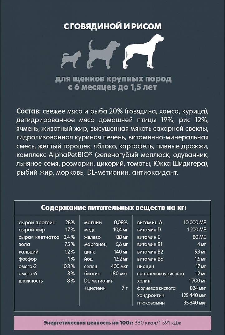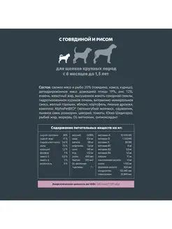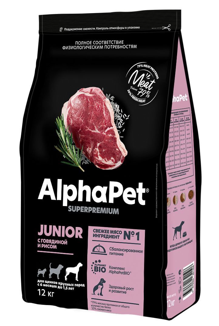 Корм для щенков сухой AlphaPet Superpremium для животных крупных пород с 6 мес. до 1,5 лет, с говядиной и рисом, 18 кг