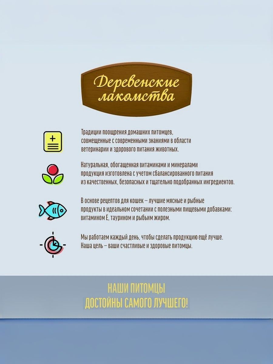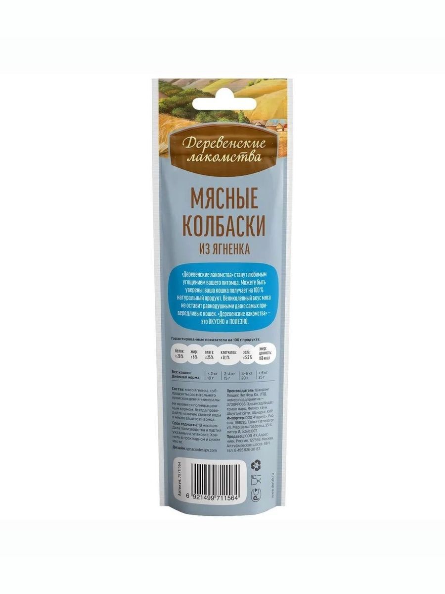 Деревенские лакомства 0,045кг колбаски мясные из ягненка для кошек - это идеальное лакомство для вашего питомца. Наши деревенские колбаски специально разработаны для удовлетворения потребностей вашего кота в мясе и белке. Вы можете купить эти вкусные колбаски прямо сейчас и порадовать своего питомца. Наш продукт изготовлен из натуральных ингредиентов, включая свежее мясо ягненка. Колбаски обогащены витаминами и минералами, что делает их не только вкусным лакомством, но и полезным для здоровья вашего кота. Сливочная текстура колбасок обеспечивает легкое жевание и усваивание. Покупая наши колбаски, вы дарите своему питомцу не только вкусное угощение, но и заботу о его здоровье. Не упустите возможность порадовать своего кота и купить эти деревенские лакомства прямо сейчас