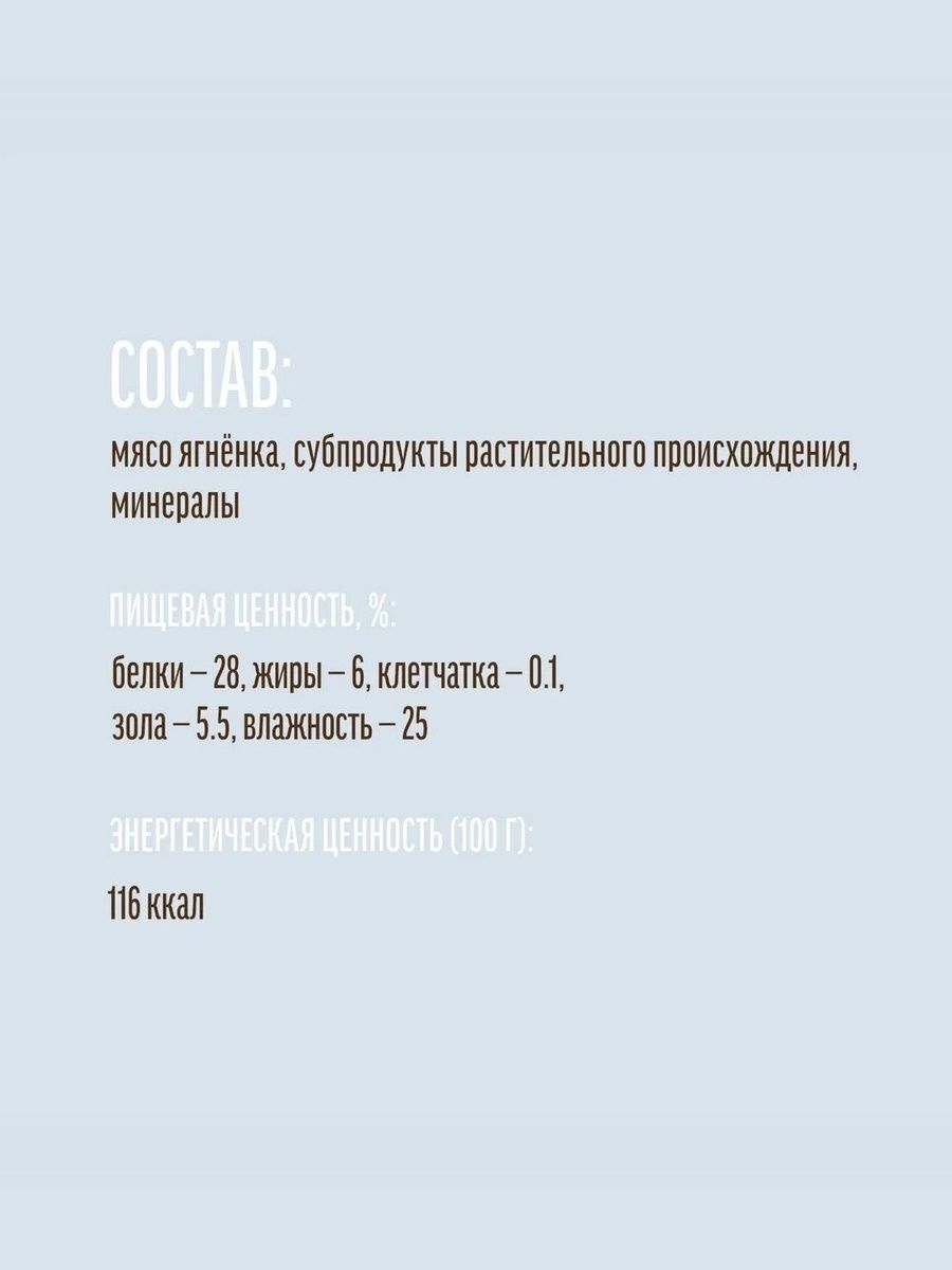 мясо ягнёнка, кукурузный крахмал. мясо ягнёнка, кукурузный крахмал. Гарантированные показатели на 100 г продукта: белок — 28 г, жир — 6,0 г, влага — 25 г, клетчатка — 0,1 г, энергетическая ценность — 166 ккал.