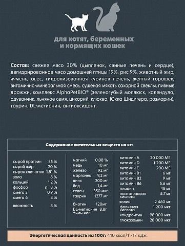 - **Баланс витаминов, микроэлементов и минеральных веществ**. В состав входит витамины, необходимые для правильного формирования скелета у котят, а также для поддержания здоровья беременных и кормящих кошек.