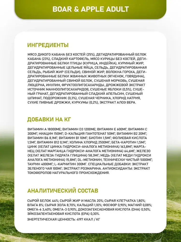 сырой жир и масла 20,00%, сырая клетчатка 1,80%, сырой белок 44,00%, влага 8,00%, сырая зола 8,70%, кальций 1,10%, фосфор 0,90%, магний 0,08%, Омега-6 - 3,40%, Омега-3 - 0,90%, докозагексаеновая кислота (DHA) 0,50%, эйкозапентаеновая кислота (EPA) 0,30%.