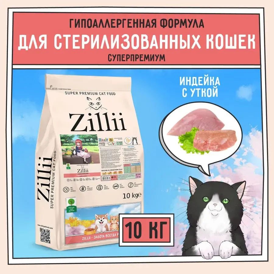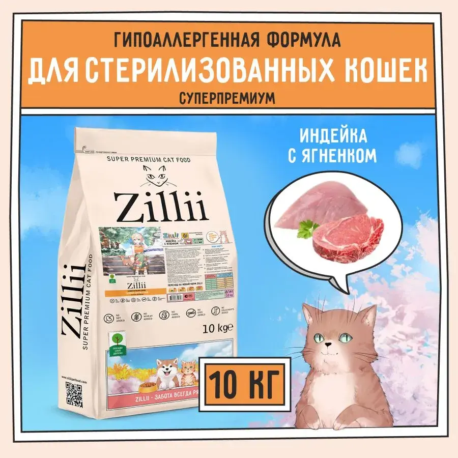 Корм для стерилизованных кошек сухой ZILLII Cat Sterilized Light 10кг, для животных с избыточным весом, с индейкой и ягнёнком