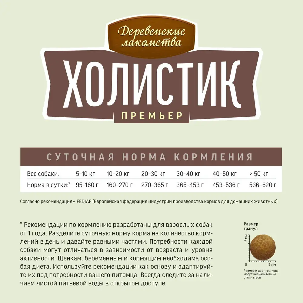 Корма для собак холистик Деревенские лакомства обеспечивают высокий уровень белка (≥31%) и жиров (≥17,6%), что делает питание сбалансированным и насыщенным. Низкое содержание влаги (≤9%) и клетчатки (≤3,5%) способствует качественному пищеварению.