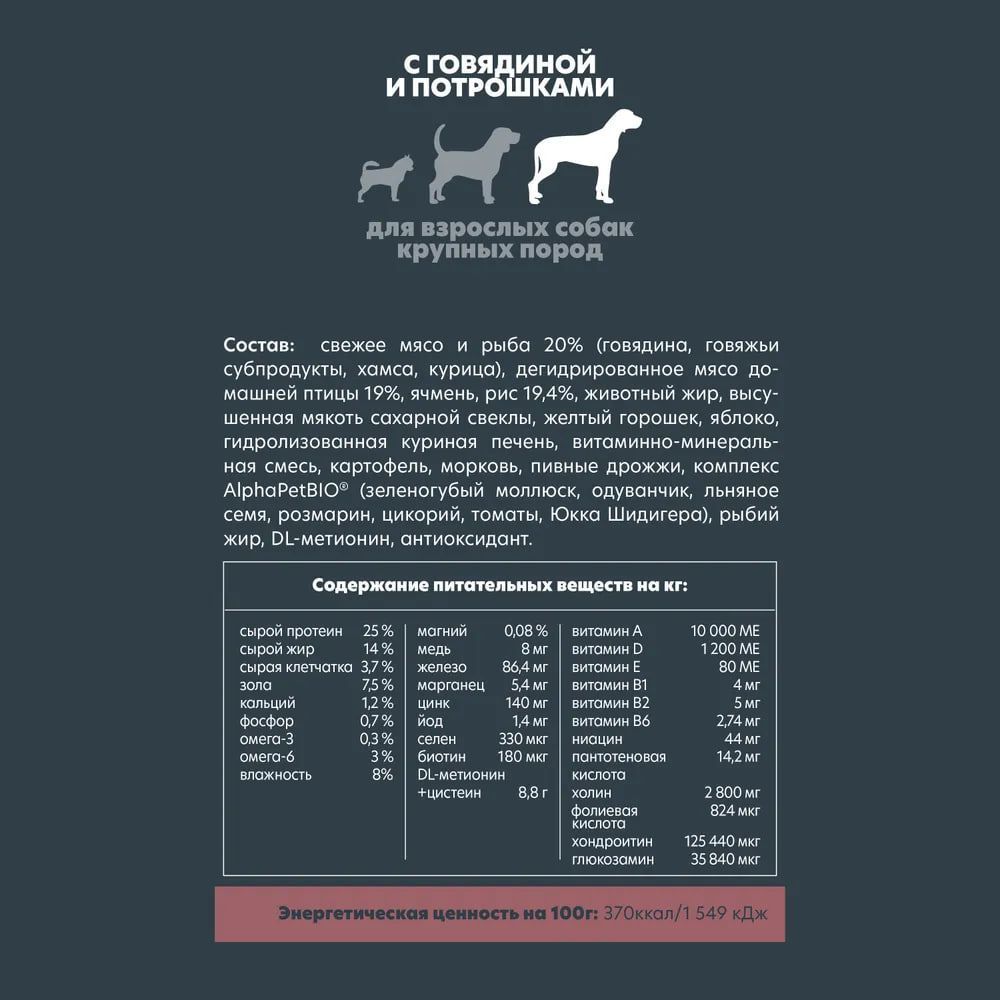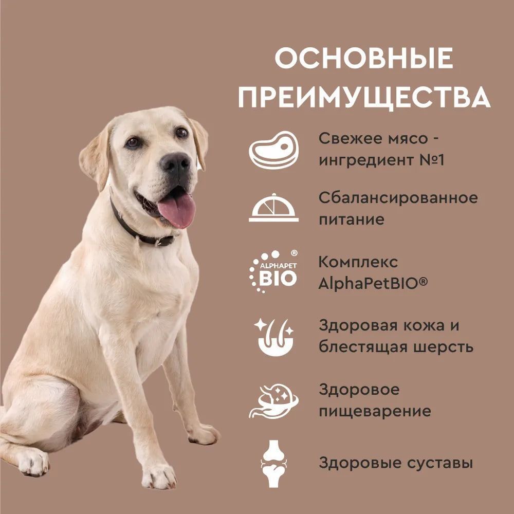 Рекомендован взрослым животным с 1,5 до 5 лет и весом от 26 кг. • 79% мясного белка • 20% свежего мяса • Уникальный комплекс натуральных добавок AlphaPetBIO® •Сбалансированное содержание белков, витаминов и минералов, а также зеленогубый моллюск, богатый хондопротекторами (хондроитин, глюкозамин) для поддержания здоровья суставов и скелета. •Натуральные ингредиенты •Не содержит ГМО, искусственных красителей и ароматизаторов •Ингредиенты, пригодные в пищу человеку, уровня Human Grade •Бережная технология, сохраняющая вкусовые и питательные свойства свежего мяса
