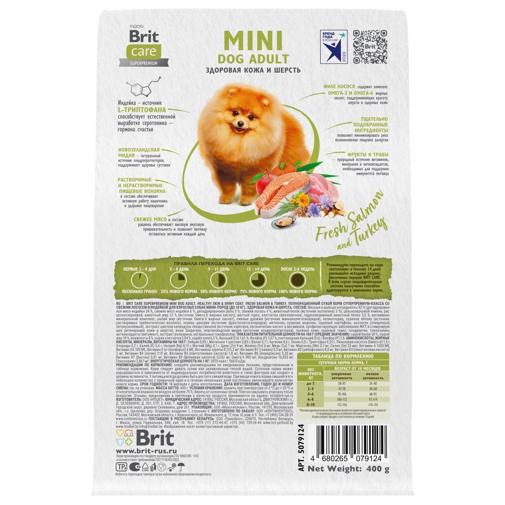 Brit Care Superpremium Mini Dog Adult. Healthy Skin & Shiny Coat. Fresh Salmon & Turkey. Полнорационный сухой корм суперпремиум-класса со свежим лососем и индейкой для взрослых собак мини-пород (до 10 кг). Здоровая кожа и шерсть.