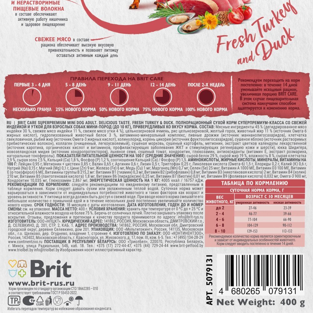 Brit Care Superpremium Mini Dog Adult. Delicious Taste. Fresh Turkey & Duck. Полнорационный сухой корм суперпремиум-класса со свежей индейкой и уткой для взрослых собак мини-пород (до 10 кг), привередливых ко вкусу корма.