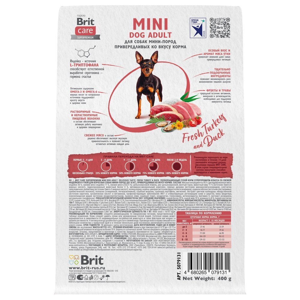 Brit Care Superpremium Mini Dog Adult. Delicious Taste. Fresh Turkey & Duck. Полнорационный сухой корм суперпремиум-класса со свежей индейкой и уткой для взрослых собак мини-пород (до 10 кг), привередливых ко вкусу корма.