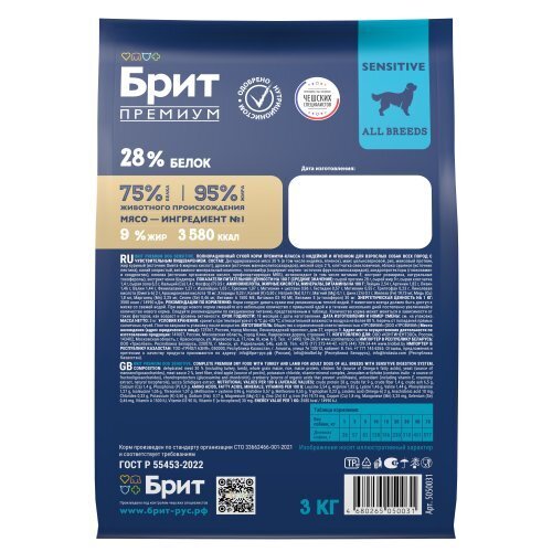 Корм сухой для взрослых собак всех пород с чувствительным пищеварением с ягненком и индейкой Sensitive, 3 кг. Полнорационный сухой корм Brit Premium Sensitive с ягненком и индейкой для взрослых собак всех пород с чувствительным пищеварением. Brit Premium - корм премиум класса с высоким содержанием мяса 30%, в том числе мясо ягненка, индейки. Состав идеально сбалансирован и отвечает всем потребностям в зависимости от возраста и породы. Содержание незаменимых аминокислот способствуют здоровому гармоничному развитию. Баланс витаминов и минералов для крепкого иммунитета, а также пребиотики для здорового пищеварения. Использование злаков с различным гликемическим индексом - создает чувство насыщения, снижает гликемический индекс злаковой составляющей. Соблазнительный аромат и прекрасный вкус обеспечивается за счет свежих натуральных ингредиентов. Не содержит искусственных добавок, красителей, ароматизаторов.