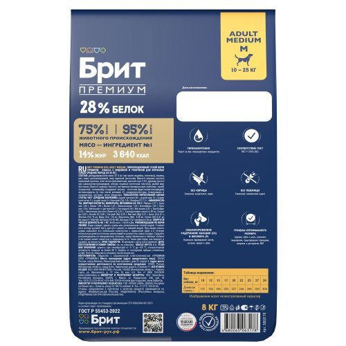 Brit Premium Dog Adult Medium. Полнорационный сухой корм премиум-класса с индейкой и телятиной для взрослых собак средних пород (10-25 кг), 8 кг