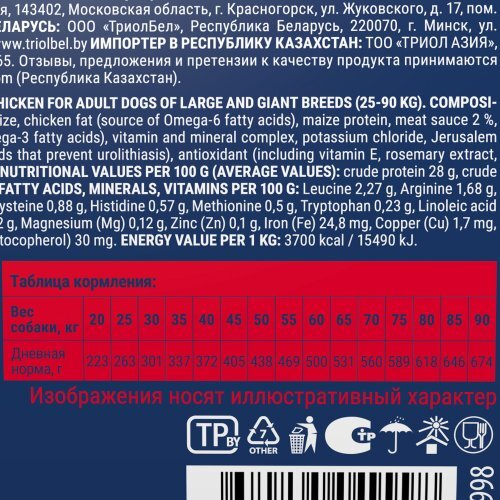 Дегидрированное мясо 30 % (в том числе мясо курицы 14 %), пшеница цельнозерновая, маис цельнозерновой, жир куриный (источник Омега-6 жирных кислот), маисовый протеин, мясной соус 2 %, дрожжи (источник маннанолигосахаридов), яблоко сушеное (источник пектина), рыбий жир (источник Омега-3 жирных кислот), витаминно-минеральный комплекс, калий хлористый, топинамбур (содержит инулин - источник фруктоолигосахаридов), клюква (источник органических кислот, профилактирующих МКБ), антиоксидант (в том числе витамин Е, экстракт розмарина, натуральные токоферолы), хондропротекторы (глюкозамин и хондроитин), экстракт юкки Шидигера. Показатели питательной ценности на 100 г (средние значения): сырой протеин 28 г, сырой жир 12 г, сырая клетчатка 1,5 г, сырая зола 6,9 г, Кальций (Са) 1,8 г, Фосфор (Р) 1,2 г. Аминокислоты, жирные кислоты, минералы, витамины на 100 г: Лейцин 2,27 г, Аргинин 1,68 г, Лизин 1,36 г, Валин 1,31 г, Фенилаланин 1,19 г, Изолейцин 1,01 г, Треонин 0,95 г, Метионин + цистеин 0,88 г, Гистидин 0,57 г, Метионин 0,5 г, Триптофан 0,23 г, Линолевая кислота (Омега-6) 2,22 г, Арахидоновая кислота 20 мг, Хлориды 0,35 г, Калий (К) 0,52 г, Натрий (Na) 0,22 г, Магний (Mg) 0,12 г, Цинк (Zn) 0,1 г, Железо (Fe) 24,8 мг, Медь (Cu) 1,7 мг, Марганец (Mn) 3,7 мг, Селен (Se) 0,41 мг, Витамин A 1500 МЕ, Витамин D3 90 МЕ, Витамин E (α-токоферол) 30 мг. Энергетическая ценность на 1 кг: 3700 ккал / 15490 кДж.