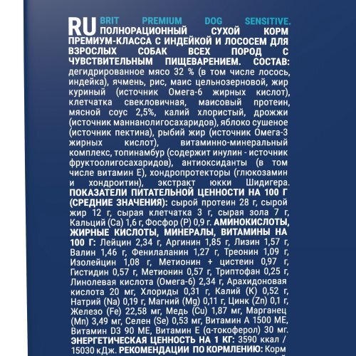 Brit Premium Dog Sensitive. Полнорационный сухой корм премиум-класса с индейкой и лососем для взрослых собак всех пород с чувствительным пищеварением, 15 кг