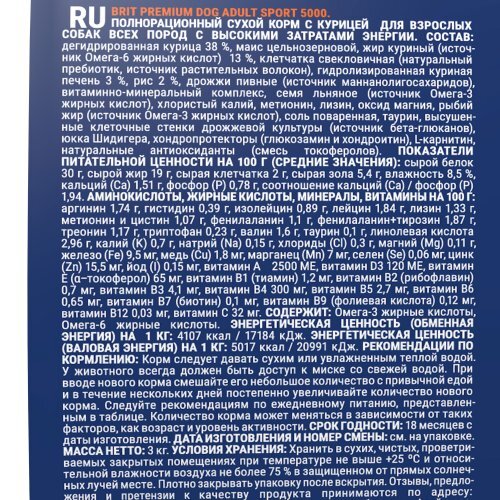 Полнорационный корм с высоким содержанием энергии Brit Premium Sport 5000 разработан специально для взрослых собак всех пород, подверженных затяжным и повышенным физическим нагрузкам.