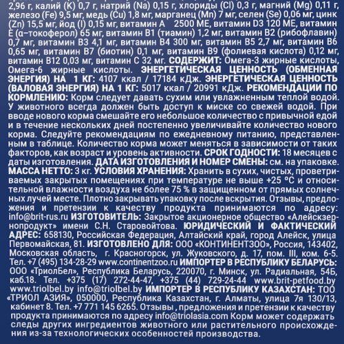 Витамины, минералы, аминокислоты на 1 кг: аргинин 1,74 г, гистидин 0,39 г, изолейцин 0,89 г, лейцин 1,84 г, лизин 1,33 г, метионин и цистин 1,07 г, фенилаланин 1,1 г, фенилаланин+тирозин 1,87 г, треонин 1,17 г, триптофан 0,23 г, валин 1,6 г, таурин 0,1, линолевая кислота 2,96 г, калий (K) 0,7 г, натрий (Na) 0,15 г, хлориды (Cl) 0,3 г, магний (Mg) 0,11 г, железо (Fe) 9,5 мг, медь (Cu) 1,8 мг, марганец (Mn) 7 мг, селен (Se) 0,06 мг, цинк (Zn) 15,5 мг, йод (I) 0,15 мг, витамин А 2500 МЕ, витамин D3 120 МЕ, витамин Е (α–токоферол) 65 мг, витамин В1 (тиамин) 1,2 мг, витамин В2 (рибофлавин) 0,7 мг, витамин В3 4,1 мг, витамин B4 300 мг, витамин В5 2,7 мг, витамин В6 0,65 мг, витамин B7 (биотин) 0,1 мг, витамин B9 (фолиевая кислота) 0,12 мг, витамин В12 0,03 мг, витамин С 32 мг. Содержит: Омега-3 жирные кислоты, Омега-6 жирные кислоты.