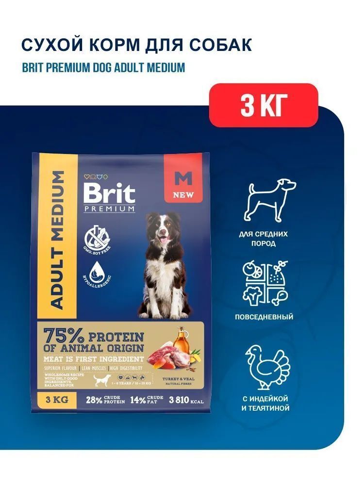 Brit Premium Dog Adult Medium. Полнорационный сухой корм премиум-класса с индейкой и телятиной для взрослых собак средних пород (10-25 кг), 3 кг