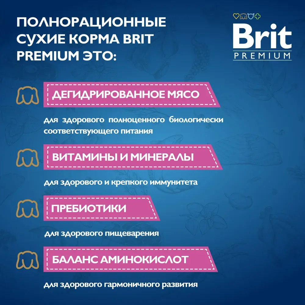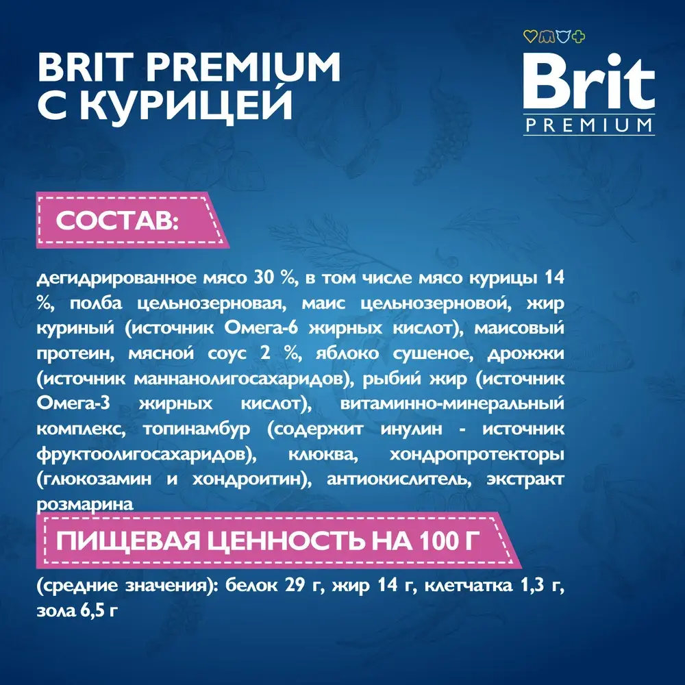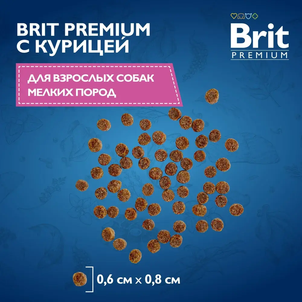 Полнорационный сухой корм Brit Premium Adult Smal с курицей для взрослых собак мелких пород (1-10 кг). Brit Premium – корм премиум класса с высоким содержанием мяса 30%, в том числе мясо курицы 14%. Состав идеально сбалансирован и отвечает всем потребностям в зависимости от возраста и породы. Содержание незаменимых аминокислот способствуют здоровому гармоничному развитию. Баланс витаминов и минералов для крепкого иммунитета, а также пребиотики для здорового пищеварения. Использование злаков с различным гликемическим индексом – создает чувство насыщения, снижает гликемический индекс злаковой составляющей. Соблазнительный аромат и прекрасный вкус обеспечивается за счет свежих натуральных ингредиентов. Не содержит искусственных добавок, красителей, ароматизаторов. РЕКОМЕНДАЦИИ ПО КОРМЛЕНИЮ: Корм следует давать сухим или увлажненным теплой водой. У животного всегда должен быть доступ к миске со свежей водой. ВАЖНО: При вводе нового корма смешайте его небольшое количество с привычной едой и в течение нескольких дней постепенно увеличивайте количество нового корма. Следуйте рекомендациям по ежедневному питанию, представленным в таблице. Количество корма может меняться в зависимости от таких факторов, как возраст и уровень активности. Внешний вид товаров и упаковки может отличаться от изображенных на Сайте. Информацию на стикере считать приоритетной!