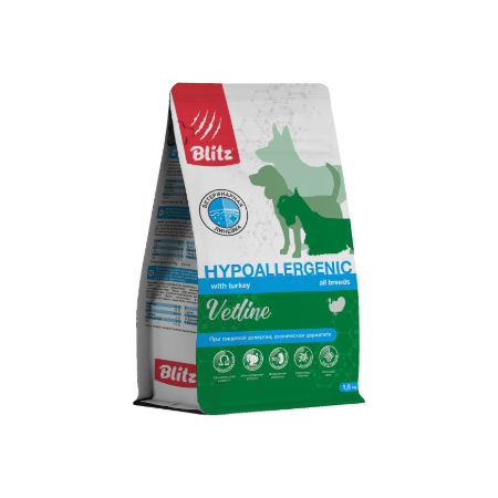 Сухой корм Blitz Hypoallergenic — полноценное питание для собак и одновременно диета, способная значительно улучшить состояние питомцев, склонных к поражениям кожного и шерстного покрова, зуду, повышенному метеоризму и частым диареям.