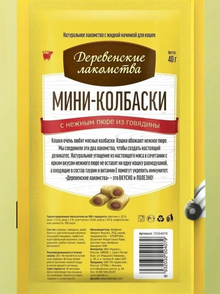 Приобретите деревенские лакомства мини-колбаски с пюре из говядины прямо сейчас и убедитесь в их качестве и вкусе. Внутри 1 упаковки 4 пакетика, каждая в индивидуальной упаковке. Всегда свежая порция для вашего питомца!