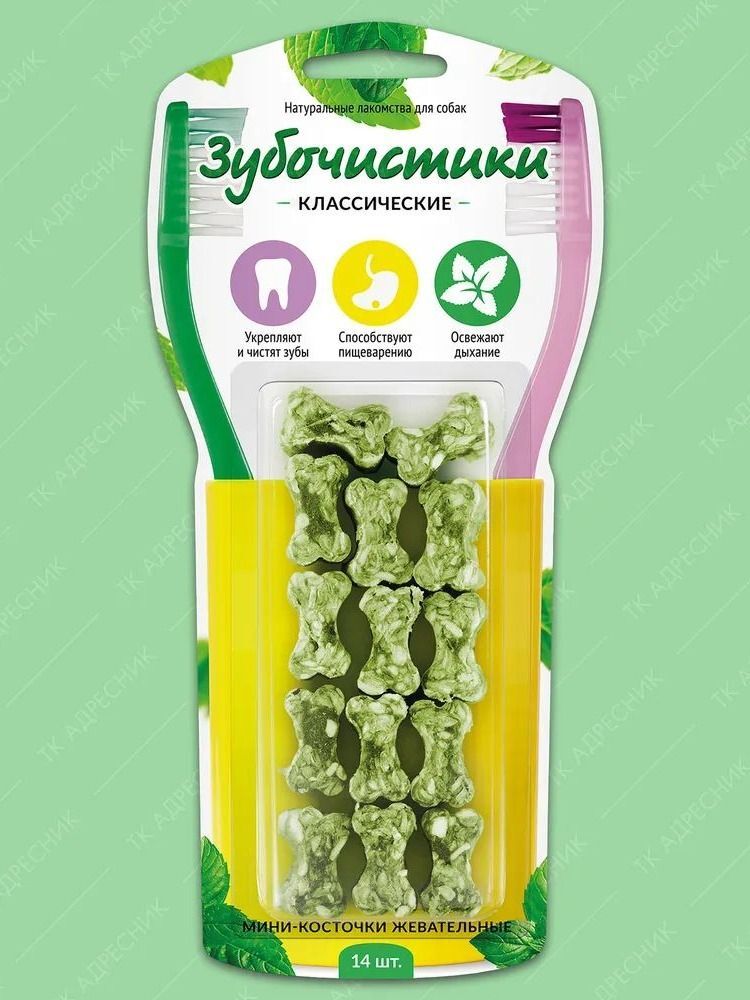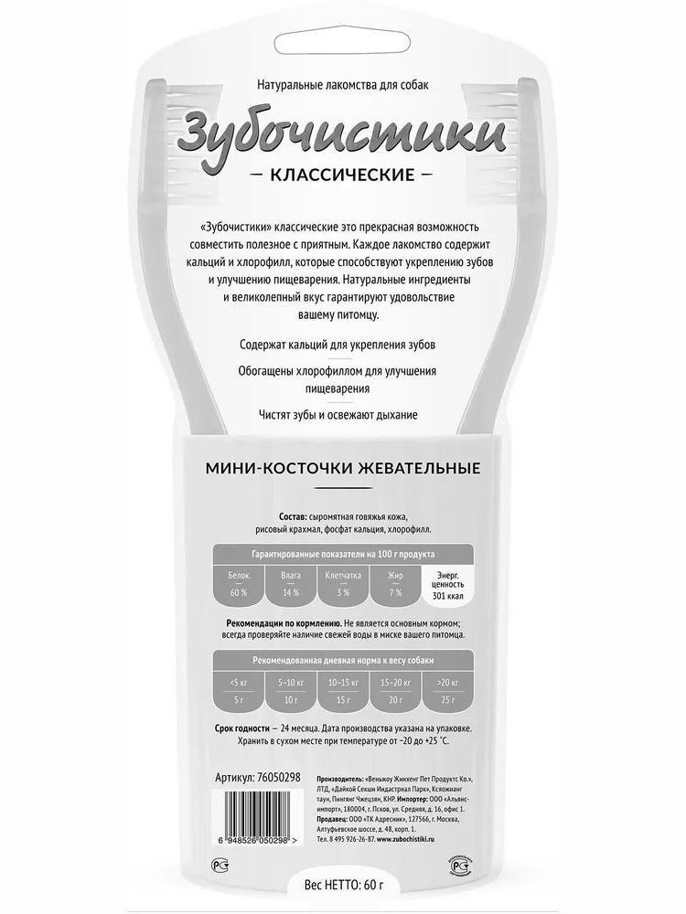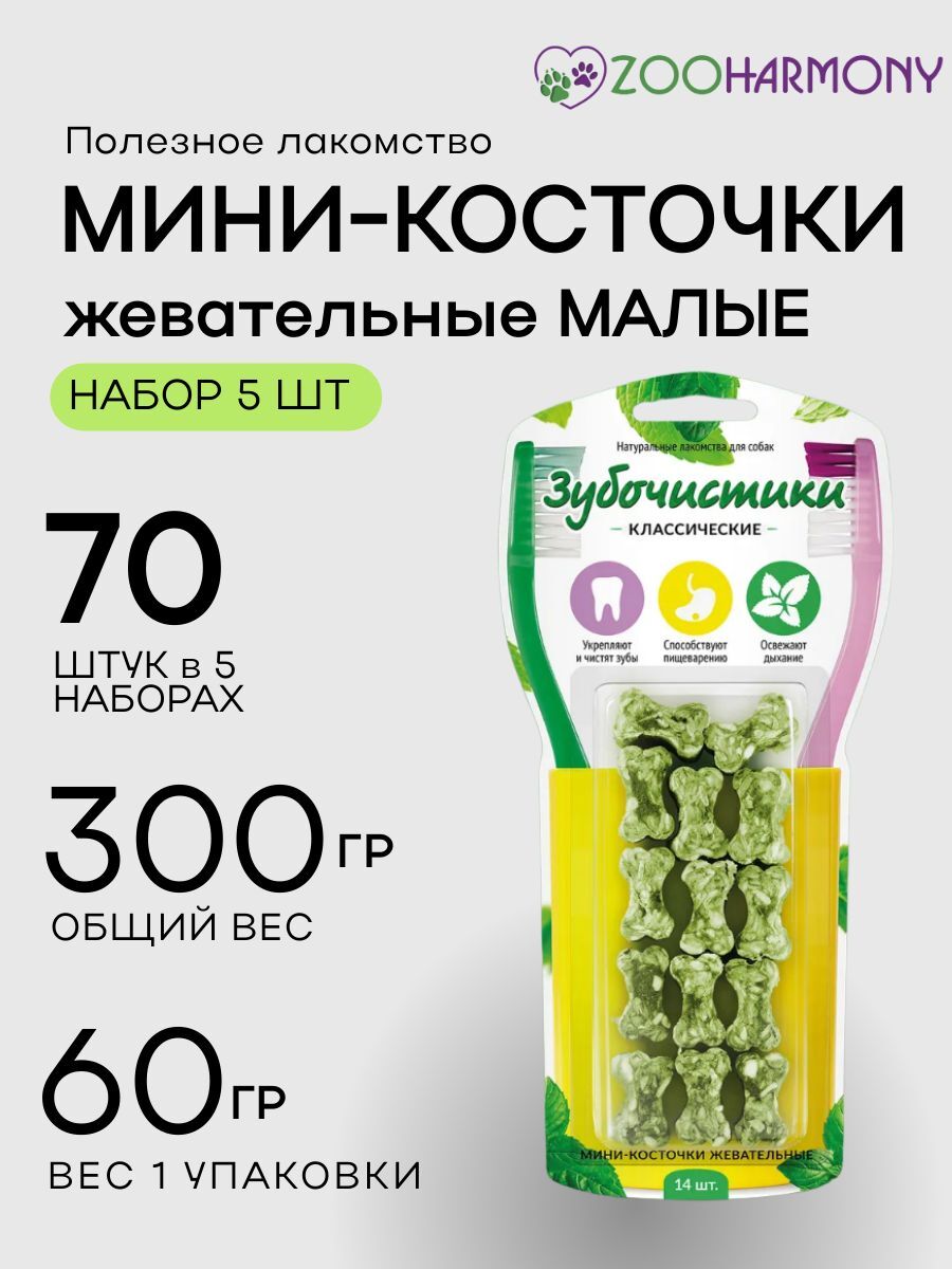 Набор из 5 пакетов по 14 шт Зубочистики 0,06кг Мини-косточки жевательные - это идеальное лакомство для вашего питомца. Форма и структура этих лакомств способствуют механической очистке зубов и массажу десен, что делает их не только вкусным угощением, но и полезным средством для ухода за зубами вашего питомца. Разжевывание этих жевательных косточек стимулирует выделение слюны, которая помогает вымывать остатки пищи и удалять их с зубов. Благодаря содержанию кальция и хлорофилла каждое лакомство помогает укрепить зубы и улучшить пищеварение вашего питомца.«Зубочистики» классические - это прекрасная возможность совместить приятное с полезным. Натуральные ингредиенты и великолепный вкус гарантируют удовольствие вашему питомцу. Жевательные косточки, специально обернутые натуральной кожей, предназначены для долгого жевания, что способствует укреплению челюсти и зубов.