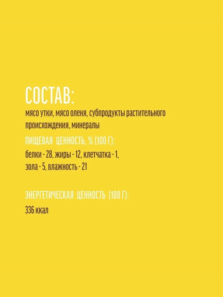мясо утки, мясо оленя, субпродукты растительного происхождения, минералы.Гарантированные показатели на 100 г продукта:белок — 28 %, жир — 12 %, влага — 21 %, клетчатка — 1 %, зола — 5 %, энергетическая ценность — 336 ккал.