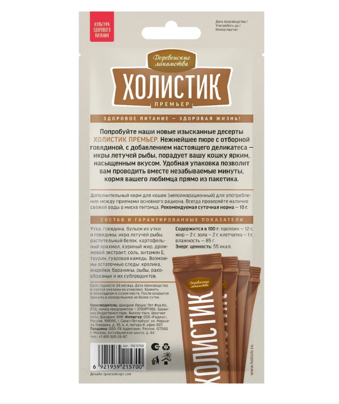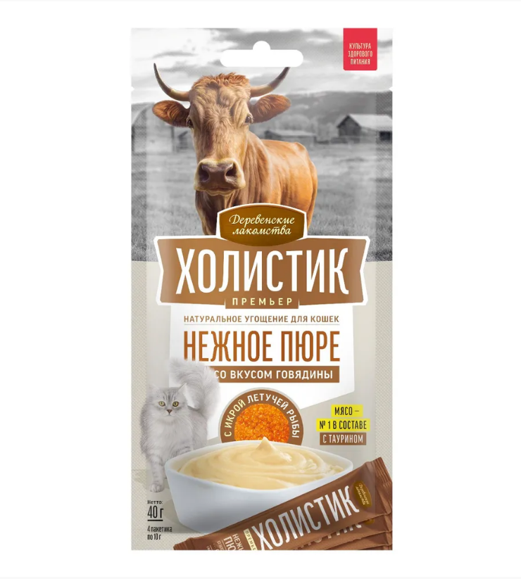 Деревенские лакомства Холистик Премьер - это изысканное лакомство для кошек, которое сочетает в себе нежное пюре с вкусом говядины и икры летучей рыбы. Благодаря своему уникальному составу, это лакомство обеспечивает вашего питомца не только вкусным угощением, но и полноценным и сбалансированным питанием. Состав продукта включает в себя только натуральные ингредиенты высочайшего качества. Утка, говядина, бульон из утки и говядины, икра летучей рыбы, гидролизат пшеничного белка, картофельный крахмал, куриный жир, дрожжевой экстракт, соль, Д-эриторбат натрия, таурин, гуаровая камедь - все эти компоненты обеспечивают вашего питомца всем необходимым для здоровья и активной жизни. Кроме того, продукт может содержать остаточные следы других видов мяса и рыбы, что дополняет рацион вашего питомца разнообразными вкусами и питательными веществами. Энергетическая ценность лакомства составляет 55 ккал на 100 грамм продукта, влажность - 85%, зола - 2%, клетчатка - 1%, жиры - 2%, белки - 12%. Это позволяет поддерживать оптимальный уровень питания вашего питомца и не перегружать его организм лишними калориями. Деревенские лакомства 4х0,01кг Холистик Премьер - это не просто лакомство, это забота о здоровье и благополучии вашего питомца. Порадуйте своего кота вкусным и полезным угощением, которое он будет обожать!