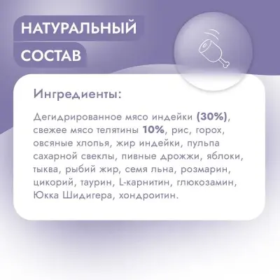 Дегидрированное мясо индейки (30%), свежее мясо телятины 10%, рис, горох, овсяные хлопья, жир индейки, пульпа сахарной свеклы, пивные дрожжи, яблоки, тыква, рыбий жир, семя льна, розмарин, цикорий, таурин, L-карнитин, глюкозамин, Юкка Шидигера, хондроитин.