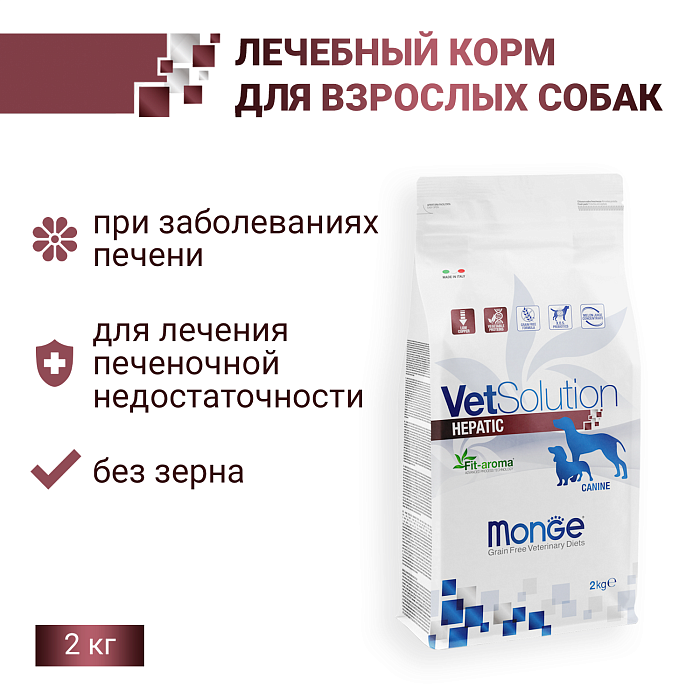 Лечебный корм Monge (Монж/Монже) VetSolution Dog Hepatic для собак при заболеваниях печени, таких как печеночная недостаточность, хронический гепатит, фиброз печени, нарушение метаболизма меди при печеночной энцефалопатии, пироплазмоз, желтуха 2 кг