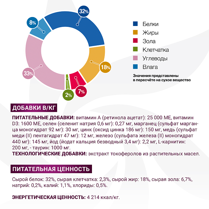 Питательные добавки: витамин А (ретинола ацетат): 25 000 МЕ, витамин D3: 1600 МЕ, селен (селенит натрия 0,27 мг): 0,16 мг, марганец (сульфат марганца моногидрат 77 мг): 25 мг, медь (сульфат меди (II) пентагидрат 39 мг): 10 мг, железо (сульфата железа (II) моногидрат 249 мг): 82 мг, йод (йодат кальция безводный 7.3 мг): 4.8 мг, L-карнитин: 200 мг, - таурин: 1000 мг.
