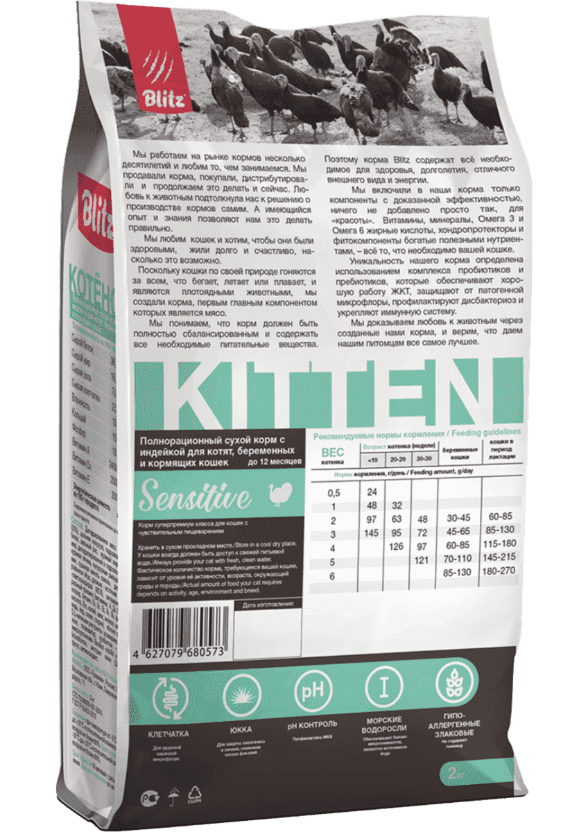 Сухой корм Blitz для котят с индейкой разработан с учётом их повышенной потребности в энергии для активных игр и познания окружающего мира. Также корм подходит для беременных и кормящих кошек, обеспечивая им необходимые питательные вещества в этот особый период.