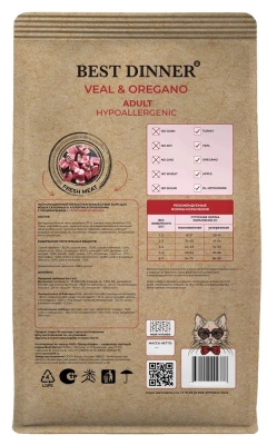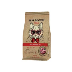 Низкозерновая рецептура для кошек Best Dinner с телятиной и орегано, изготовлена с учетом физиологических потребностей кошек. Свежая телятина с добавлением мяса индейки обогащают рацион необходимыми аминокислотами, а так же делают его потрясающе вкусным и полезным. Орегано, благодаря эфирным маслам, улучшает работу желудочно-кишечного тракта, препятствует вздутию живота. Корень цикория способствует размножению полезной кишечной микрофлоры. Гранулы в форме сердечек не оставят равнодушными даже самых привередливых кошек.
