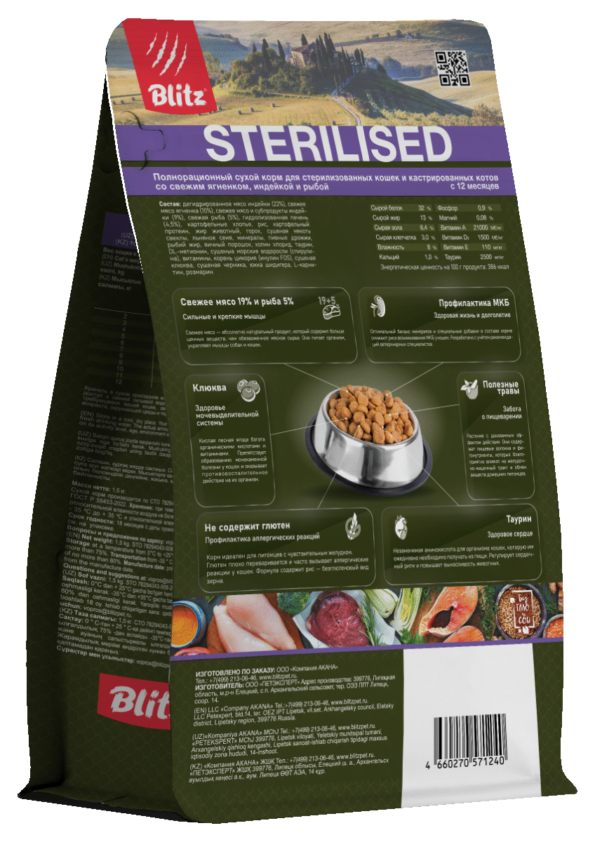Корм сухой Blitz для стерилизованных кошек включает несколько видов мяса, включая нежный ягнёнок и индейку, а также рыбу. Большая часть ингредиентов используется в свежем виде, что значительно повышает качество и питательную ценность корма. Такой подход идеально подходит для питомцев с особыми потребностями после стерилизации.