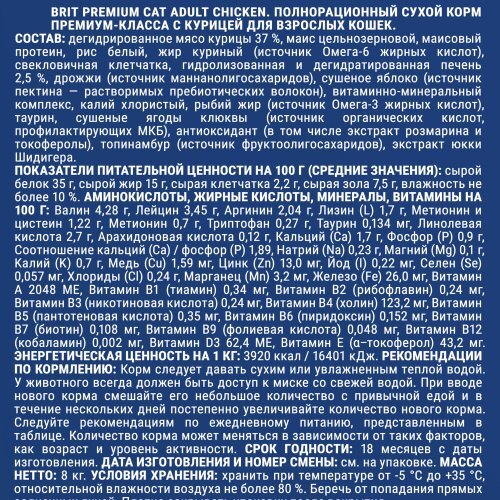 Сухой корм Brit Premium с мясом курицы предназначен для взрослых кошек всех пород. Сбалансированный состав содержит все витамины и минералы, необходимые для ежедневного здорового питания вашего питомца. Корм поможет сохранить здоровье и активность вашего питомца, а мясо курицы в составе обеспечивает притягательный аромат и вкус, который не оставит равнодушным даже самых привередливых питомцев.