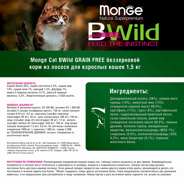 Monge (Монж) Cat BWild GRAIN FREE (холистик) полнорационный беззерновой корм из лосося и гороха для взрослых кошек и котов 1,5 кг.