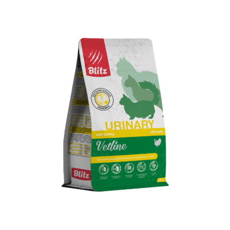 Один из наиболее востребованных кормов линейки Vetline — это диетический сухой корм для кошек Blitz Urinary Cat. Он предназначен для помощи питомцам, страдающим от образования мочевых камней струвитного типа. В составе данных уролитов преобладают соли магния, фосфора и аммония, формирующие в щелочной среде твёрдые фракции. Рацион Blitz Urinary стимулирует животных пить больше воды, а также сдвигает кислотно-щелочной баланс кошачьей мочи в сторону закисления. Это способствует растворению уже образованных солевых отложений. В свою очередь, уменьшенные дозировки магния, кальция и фосфора служат профилактикой появления новых мочевых камней.