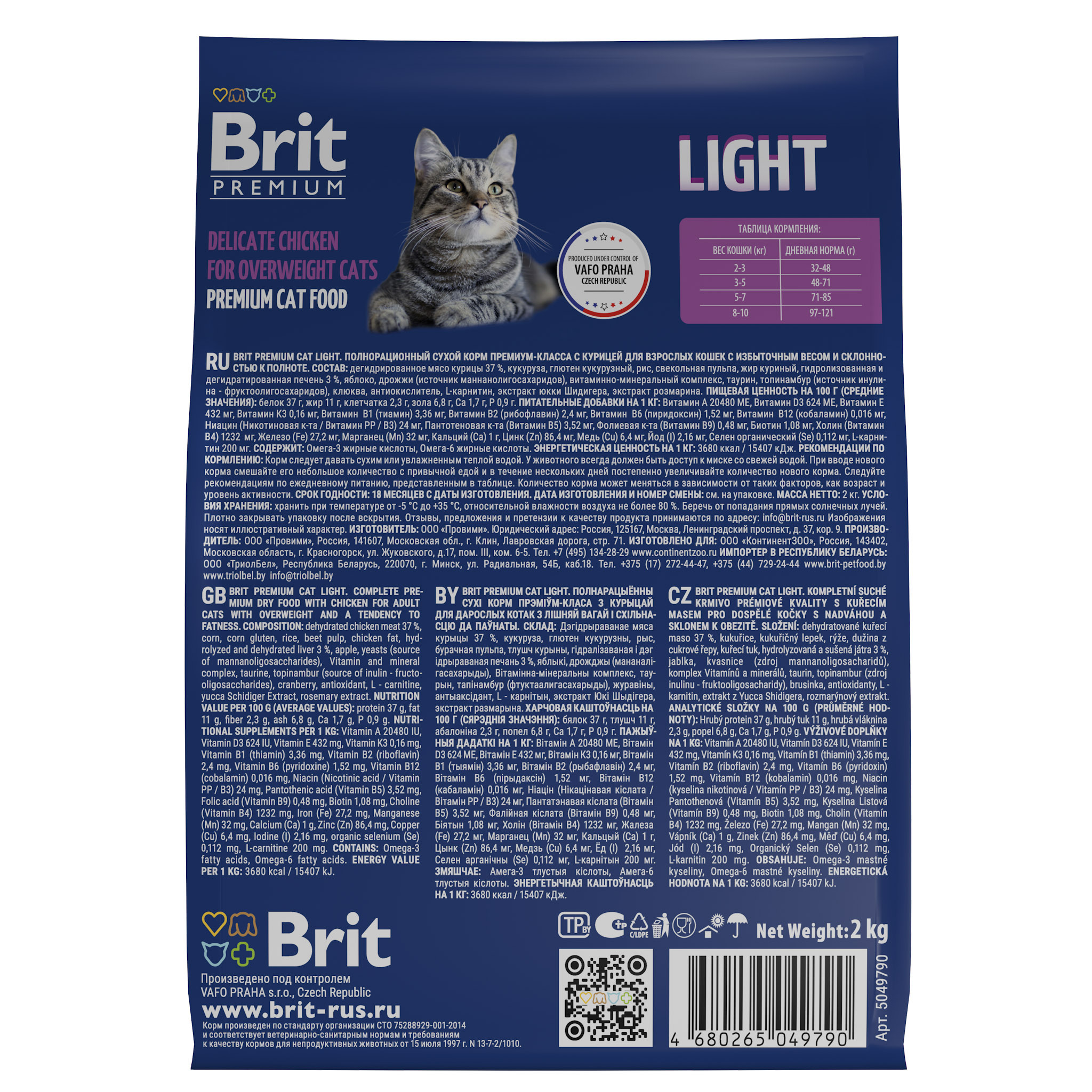 Сухой корм для кошек с избыточным весом BRIT PREMIUM с курицей Cat Light, 2кг