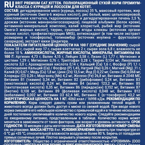 Дегидрированное мясо (курица, лосось) 35 %, маисовый протеин, жир куриный (источник Омега-6 жирных кислот), рис, маис цельнозерновой, свекловичная клетчатка, гидролизованная и дегидратированная печень 2,5 %, дрожжи (источник маннанолигосахаридов), пищевой альбумин (белок крови), витаминно-минеральный комплекс, калий хлористый, рыбий жир (источник Омега-3 жирных кислот), таурин, клюква, антиоксидант (в том числе экстракт розмарина и токоферолы), топинамбур (источник инулина - фруктоолигосахаридов), экстракт юкки Шидигера.