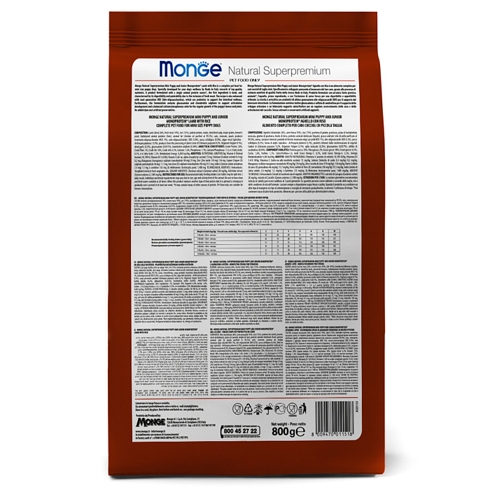 Monge (Монж) Dog Speciality Line Monoprotein Puppy & Junior Mini сухой корм из мяса ягнёнка с рисом для щенков мелких пород 800 г.