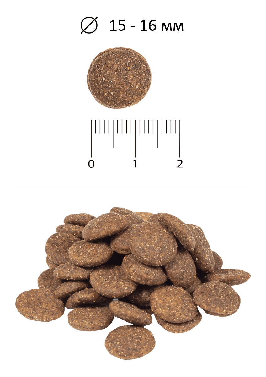 Состав: Дегидрированное мясо курицы (35%), цельный рис, цельная кукуруза, гидролизованный белок, куриный жир, рыбий жир, сушеная мякоть свеклы, витаминно-минеральный комплекс (витамины: A, D3, E, холин хлорид, B3, B5, B2, B1, B6, фолиевая кислота, B12, калий, цинк, железо, марганец, медь, йод, селен), гидролизованные мясные субпродукты, кукурузные рыльца, дегидратированное яйцо, дрожжи - источник маннаноолигосахаридов (MOS), DL- метионин, L-лизин, антиоксидант, L-карнитин, глюкозамина гидрохлорид, пробиотик - живые микроорганизмы Bacillus subtilis и Bacillus licheniformis, хондротина сульфат, экстракт розмарина, экстракт Юкки Шидигера, экстракт фенхеля, экстракт фукуса.