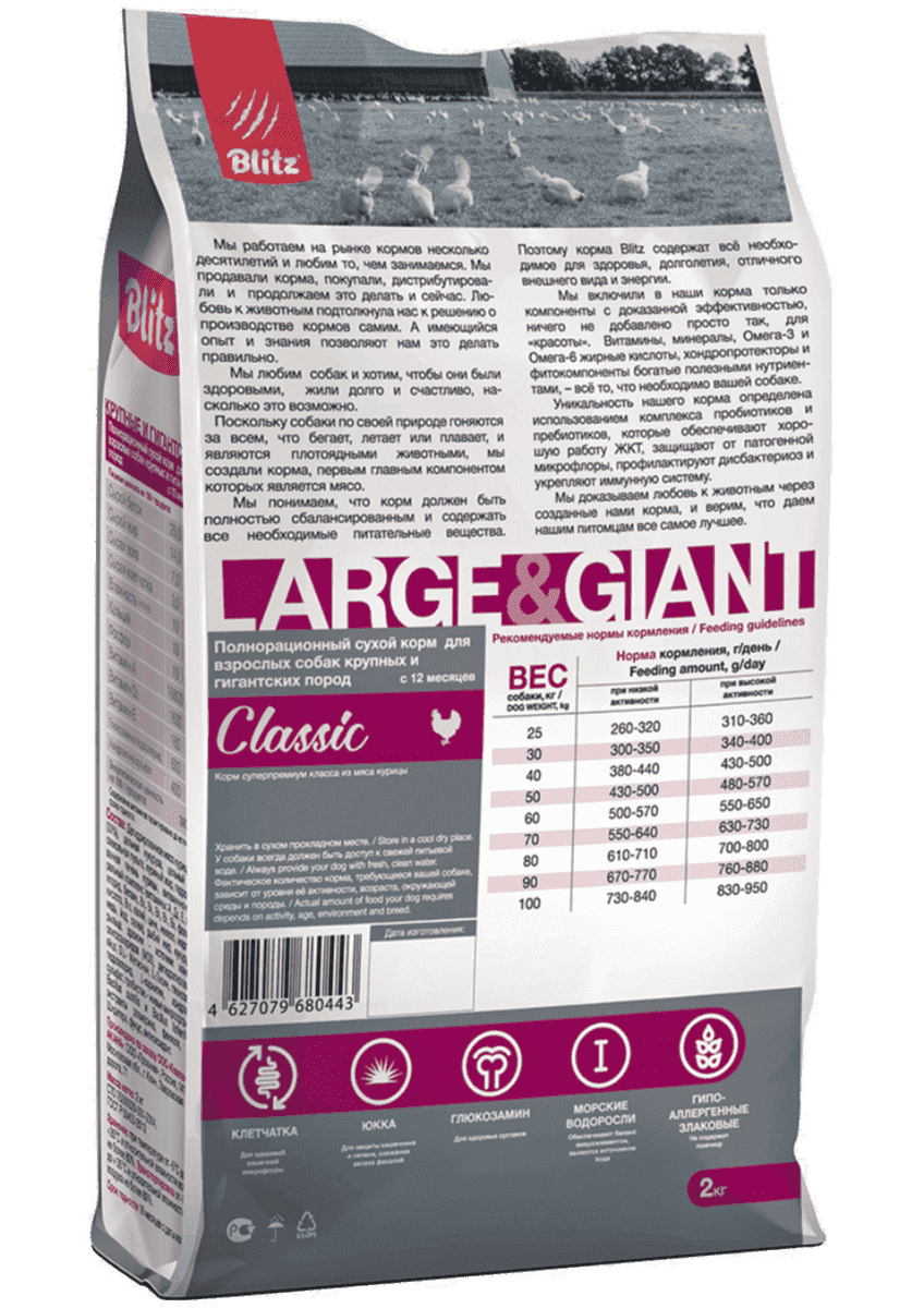 Сухой корм Blitz Adult Large & Giant Breeds — это сбалансированное и качественное питание, которое учитывает все особенности крупных и гигантских собак. Если вы хотите обеспечить своему питомцу здоровье, энергию и отличное самочувствие, рекомендуем обратить внимание на этот продукт. Многочисленные сухие корма для собак Blitz отзывы подтверждают эффективность и безопасность данного рациона.