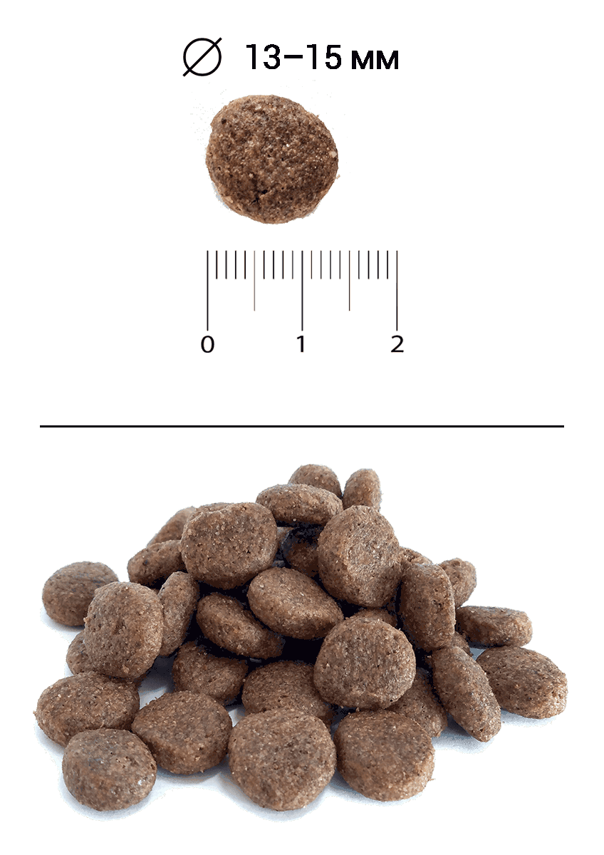 Состав: Дегидрированная форель (23%), рис (22%), свежая форель (14%), картофельные хлопья, картофельный протеин, гороховый протеин, горох, жир животный (говяжий, свиной) (10%), льняное семя, сушеная мякоть свеклы, гидролизованная печень (3%), пивные дрожжи, морские водоросли (0,3%), корень цикория (инулин FOS) (0,03%), корень одуванчика (Taraxacum officinale) (0,02%), обезвоженный гранат (Punica granatum) (0,02%), L-карнитин (0,01%), юкка шидигера (0,01%), розмарин (0,015%).