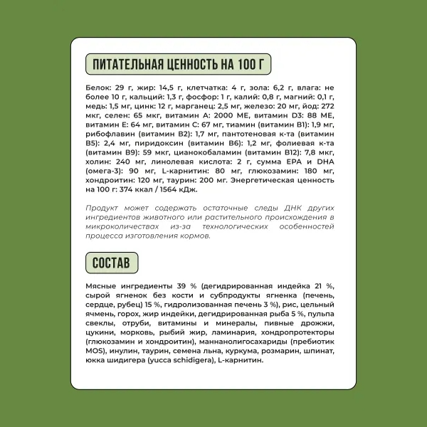 мясные ингредиенты 41 % (дегидрированная индейка 23 %, сырой ягненок без кости и субпродукты ягненка (печень, сердце, рубец) 15 %, гидролизованная печень 3 %), цельный ячмень, цельный горох, цельный белый рис, жир индейки, дегидрированная рыба 3 %, пульпа свеклы, отруби, витамины и минералы, пивные дрожжи, цукини, морковь, комплекс аминокислот, рыбий жир, цикорий, куркума, семена льна, хондропротекторы (глюкозамин и хондроитин), ламинария, маннанолигосахариды (пребиотик MOS), шпинат, юкка шидигера, розмарин