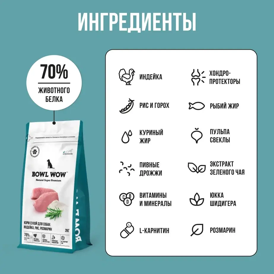 Полнорационный корм BOWL WOW с индейкой, рисом и розмарином разработан специально для собак мелких пород (весом до 10 кг). В его состав, помимо полного набора белков, жиров, углеводов, витаминов и микроэлементов, введены компоненты для заботы о здоровье десен и зубов и правильном пищеварении вашего питомца. Размер гранул 8–10 мм специально разработан для взрослых собак мелких пород.