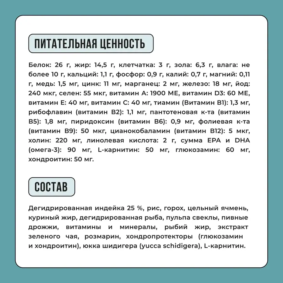 - Соответствует нормам по кормам FEDIAF, NRC и российскому ГОСТу Р 55453-2022.