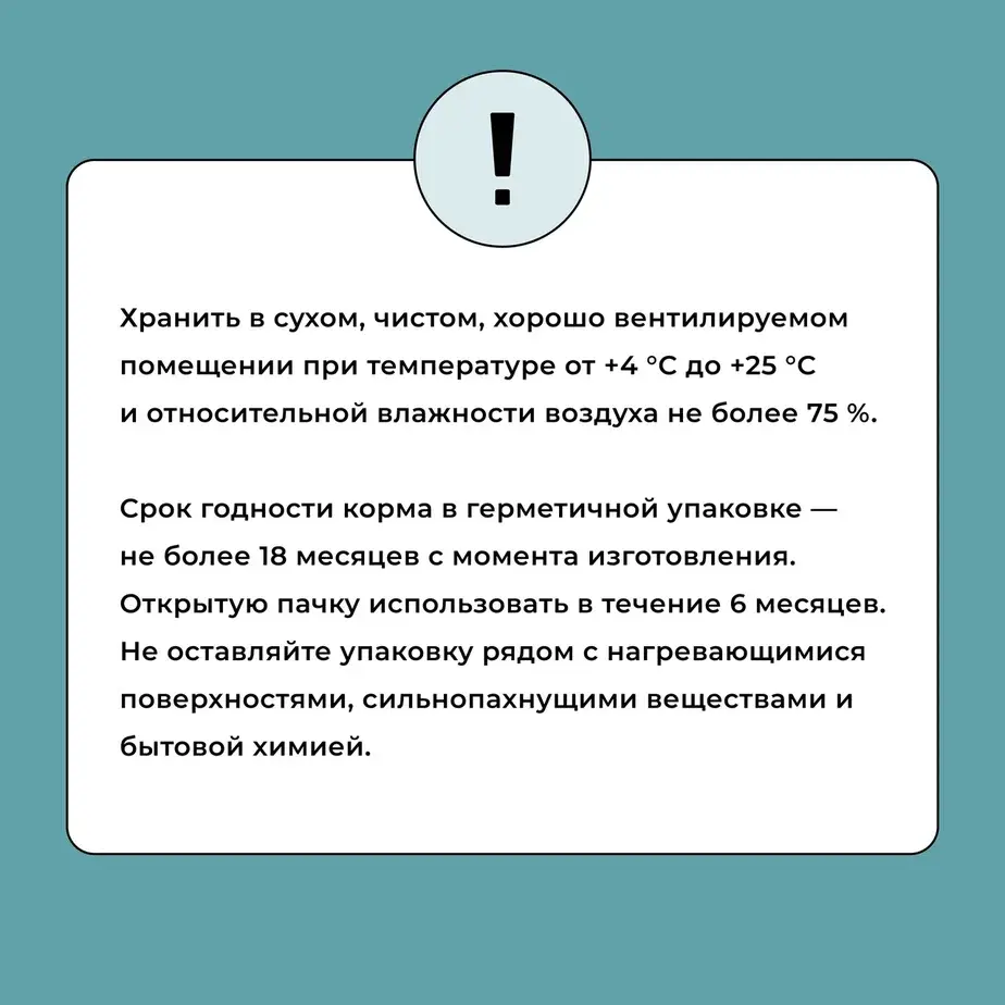 • Соответствует нормам по кормам FEDIAF, NRC и российскому ГОСТу Р 55453-2022.