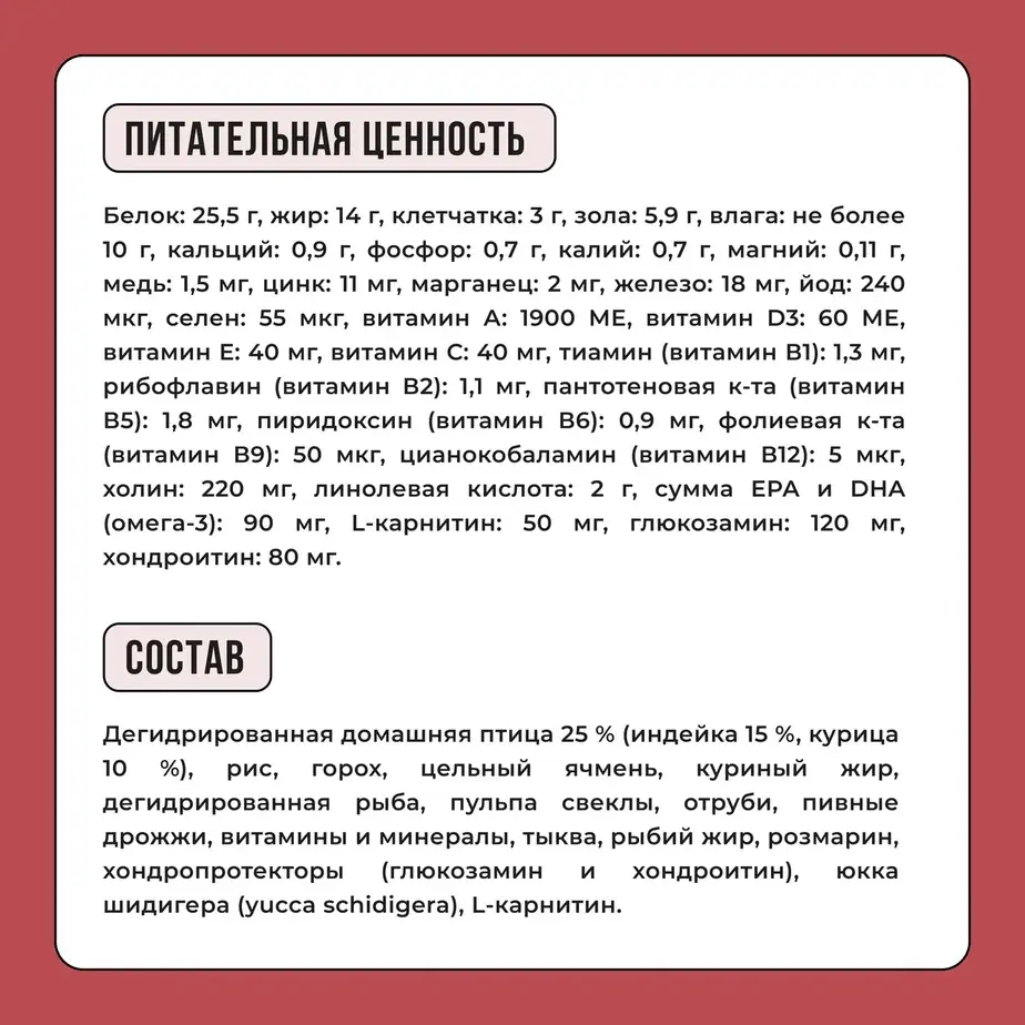 белок: 26 г, жир: 14 г, клетчатка: 5 г, зола: 4,8 г, влага: не более 10 г, кальций: 1,1 г, фосфор: 0,9 г, калий: 0,7 г, магний: 0,12 г, медь: 1,5 мг, цинк: 12 мг, марганец: 5,5 мг, железо: 19 мг, йод: 243 мкг, селен: 60 мкг, витамин А: 1780 МЕ, витамин D3: 80 МЕ, витамин Е: 58 мг, витамин С: 61 мг, тиамин (витамин В1): 1,7 мг, рибофлавин (витамин В2): 1,4 мг, пантотеновая к-та (витамин В5): 2 мг, пиридоксин (витамин В6): 1,1 мг, фолиевая к-та (витамин В9): 56 мкг, цианокобаламин (витамин В12): 5,6 мкг, холин: 243 мг, омега-3 жирные кислоты: 0,56 %, омега-6 жирные кислоты: 3,9 %, L-карнитин: 50 мг, глюкозамин: 70 мг, хондроитин: 50 мг