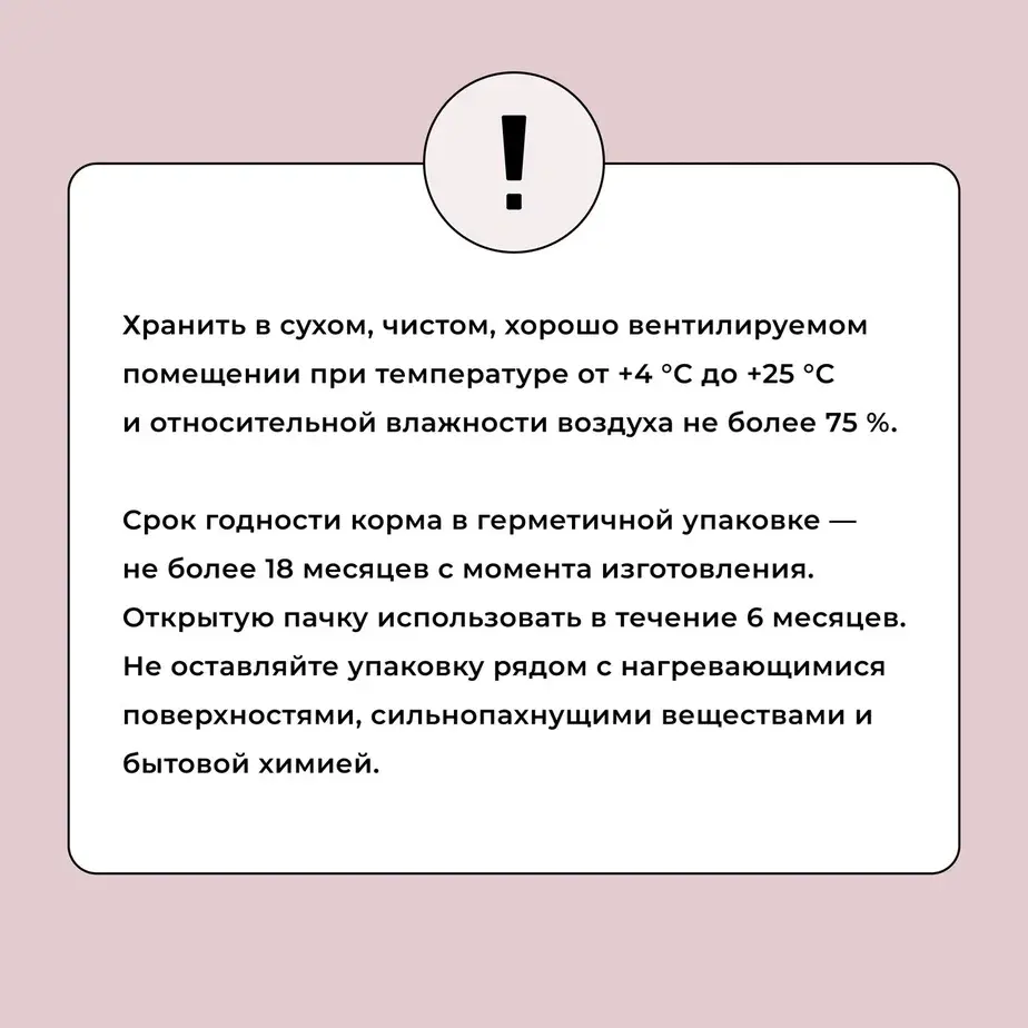 • Соответствует нормам по кормам FEDIAF, NRC и российскому ГОСТу Р 55453-2022.